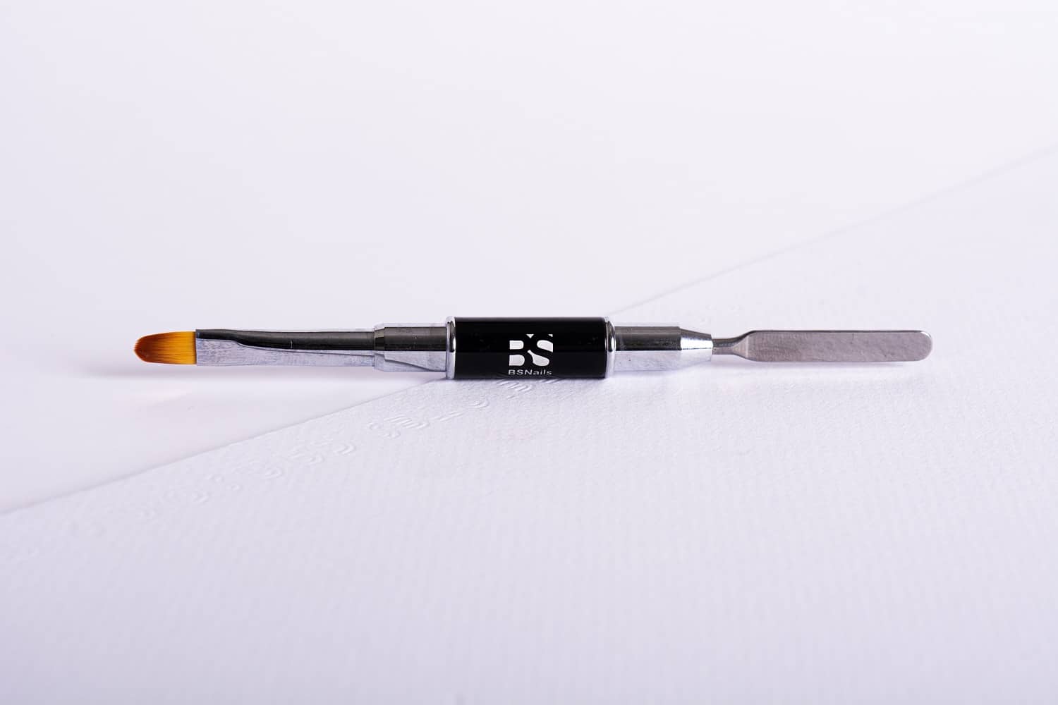 Transforma tu manicura con el pincel espátula BSNAILS. Fibra sintética Nº8, mango metálico y espátula de acero, ideal para aplicar acrigel con precisión y estilo. Color negro elegante.