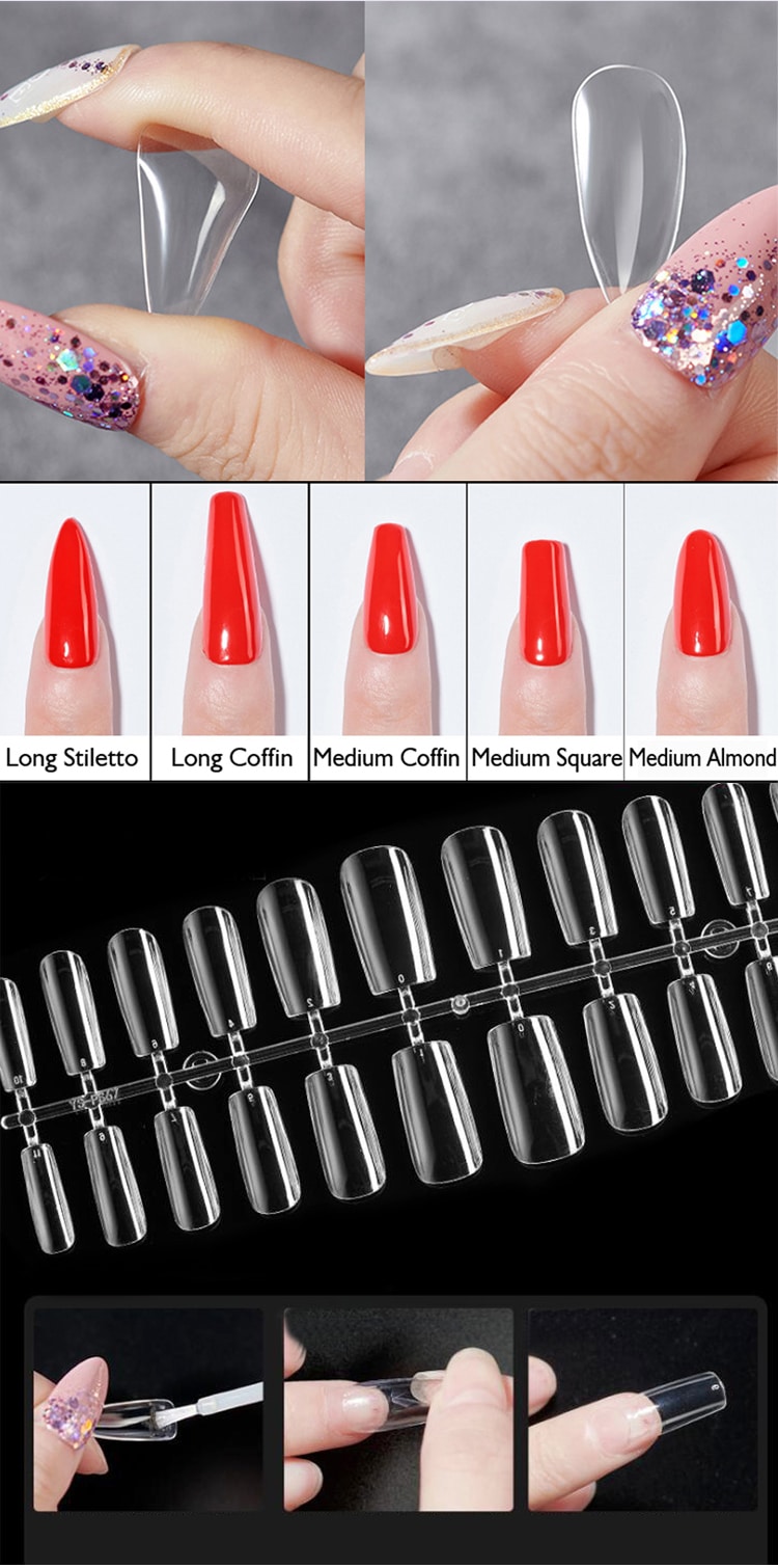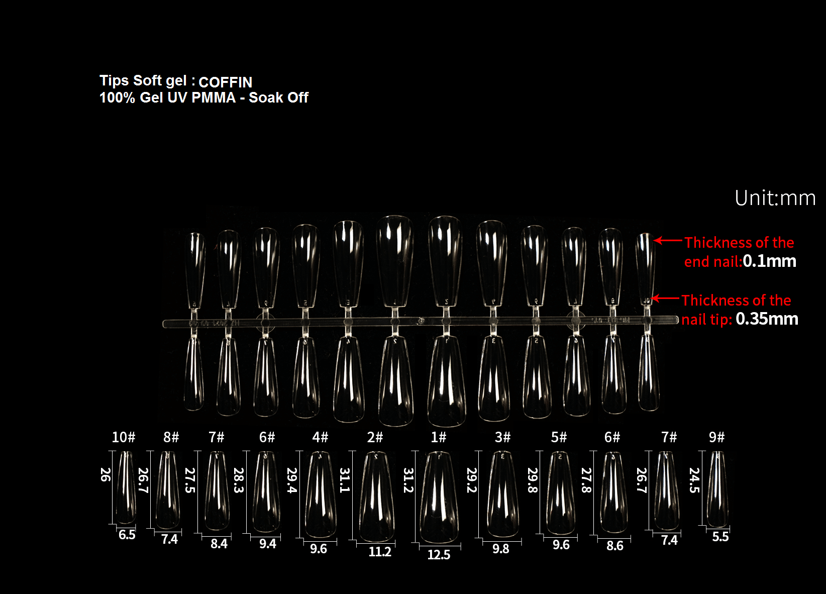 Extensiones naturales y resistentes por 30 días con BSnails Tips Soft Gel COFFIN. Ultrafinos, flexibles y transparentes, permiten un polimerizado perfecto. Rápida aplicación y fácil remoción. 500 piezas.