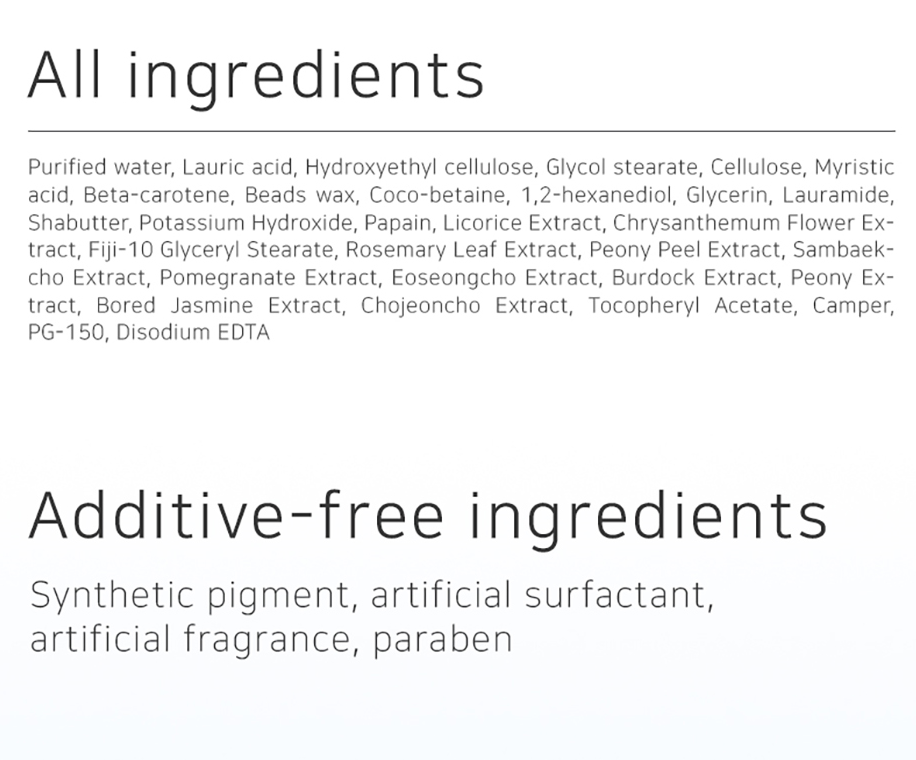 Método de aplicación: En el paso de limpieza, toma una cantidad adecuada del contenido en la palma de tu mano, haz espuma con agua, frota suavemente sobre el rostro y enjuaga con agua tibia.