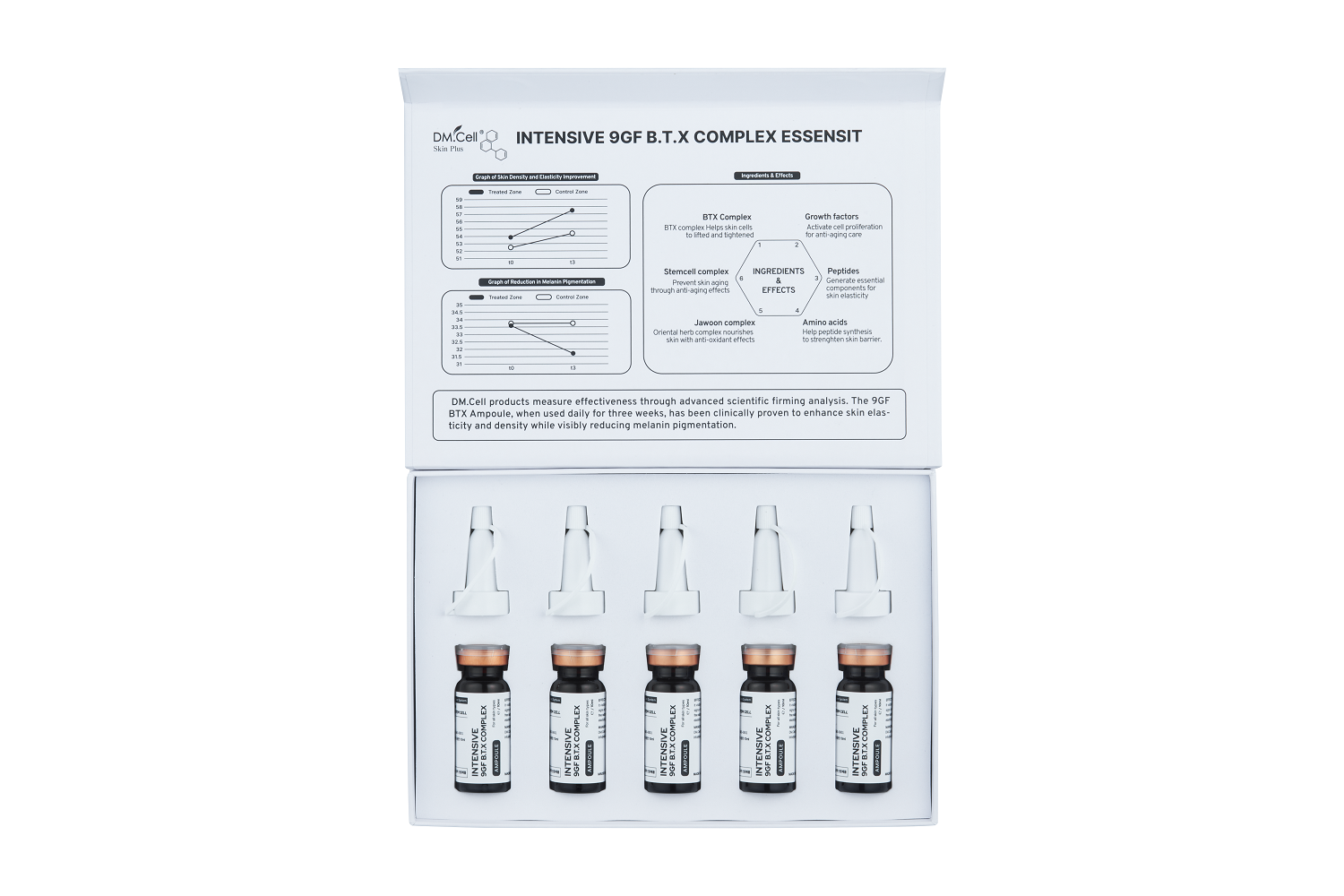Ampollas Essensit DM Cell 9GF BTX Complex Una ampolla avanzada de calidad profesional formulada para reafirmar, tensar y regenerar profundamente la piel . Esta versión mejorada (anteriormente 5GF) ofrece una potente sinergia de 9 factores de crecimiento (20%) , un complejo reafirmante herbal BTX patentado y células madre de ginseng  , formuladas para una máxima eficacia antienvejecimiento.