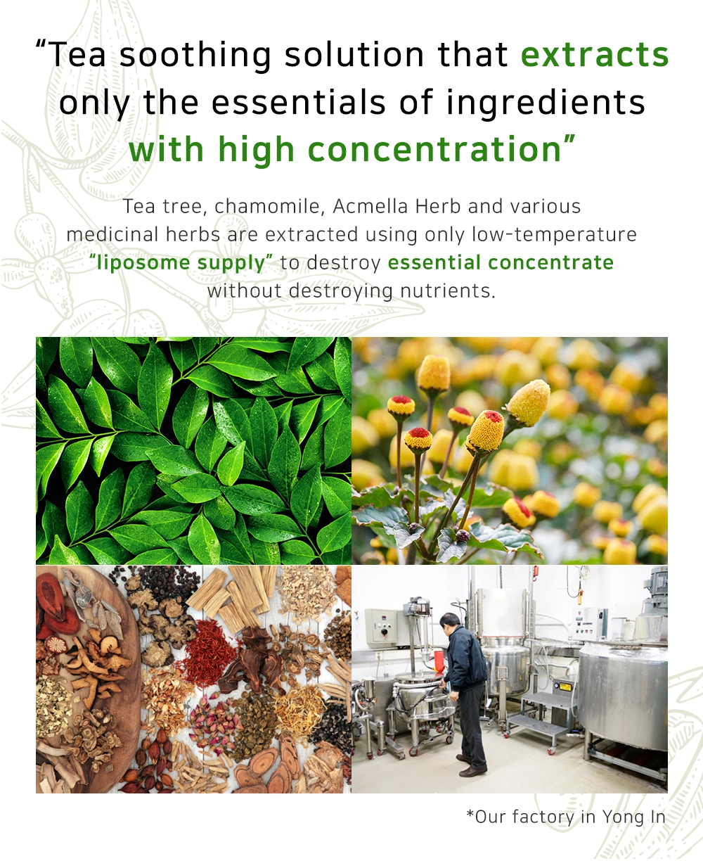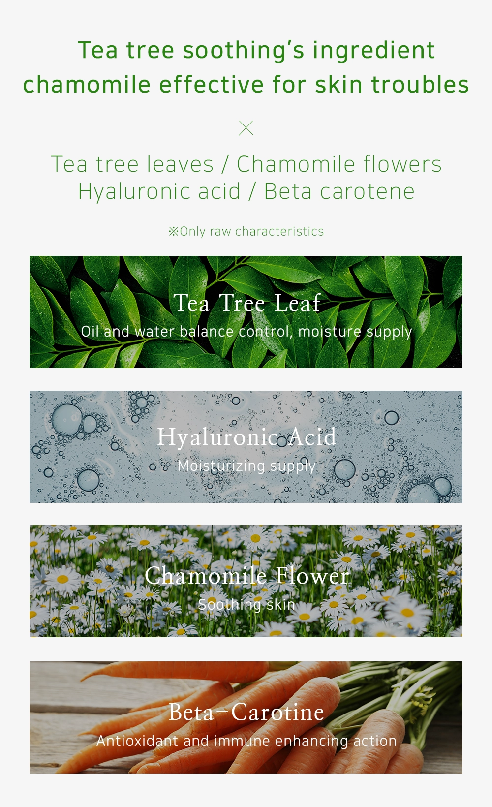 Aloe vera gel, tea-tree oil , glyceryl polymethacrylate , propylene glycol , cyclomethicone , chamomile extract , glycerin , dimeticone , sodium PCA, sodium hyaluronate , green tea ,cucumber extract , Bio Nano Protin (BNP) amino acid ,Beta-Glucan, potassium hydroxide , centella, meadowsweet algae , mugwort , tea-tree extract , carbomer ,.allantoin , dipotassium glycyrrhizinate , 1.2Hexandiol sodium EDTA.