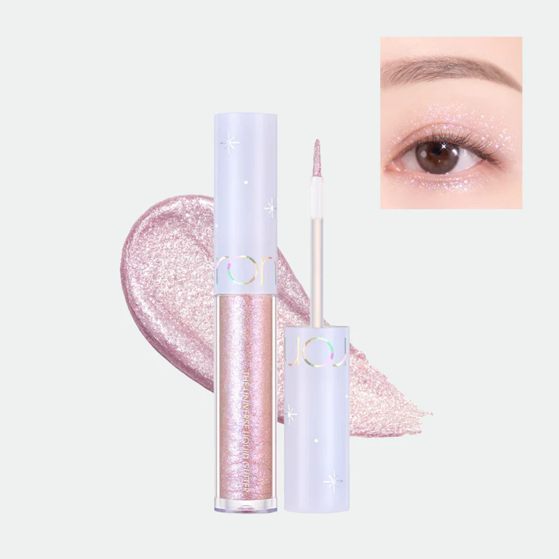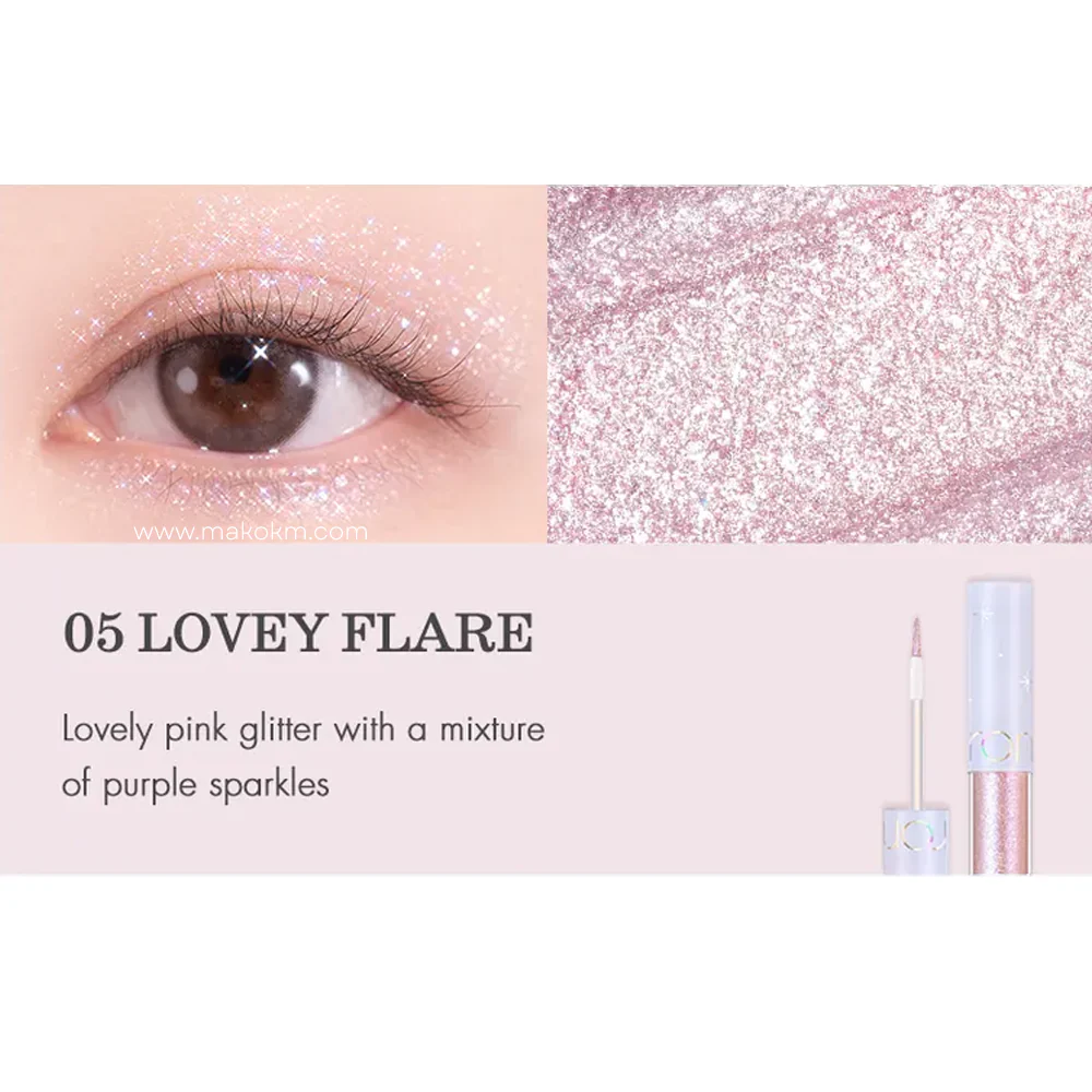 Descubre "ROM&ND The Universe Liquid Glitter #5 Lovey Flare", un glitter rosa y morado que ilumina tus ojos con destellos deslumbrantes. Fácil de aplicar, de secado rápido y duradero.